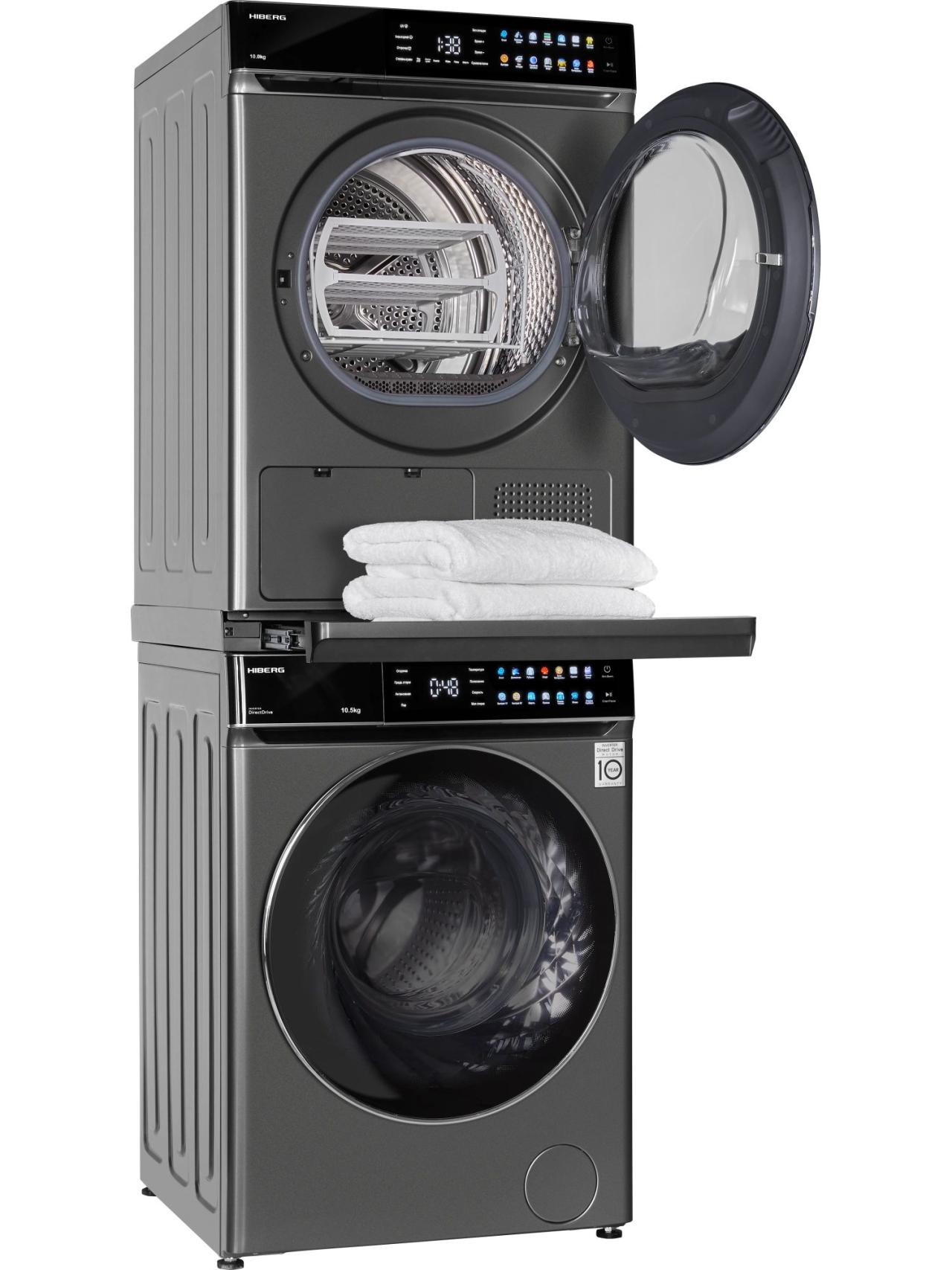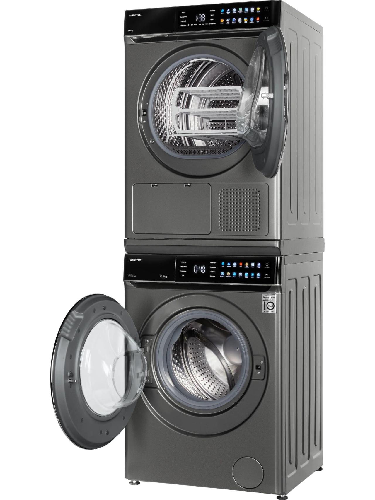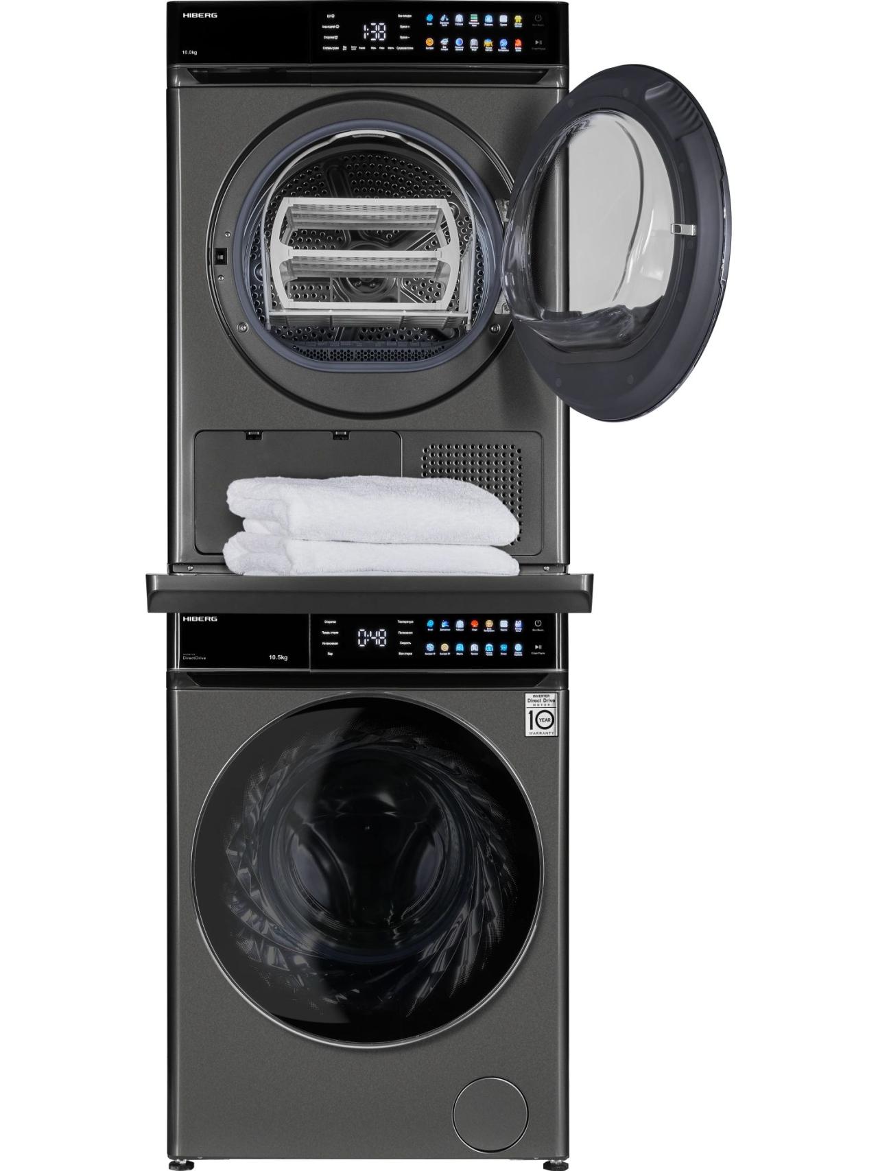 Комбинация «Сушильная машина HIBERG HDQ11 10 Sd + Стиральная машина HIBERG i-DDQ11 1014 Sd + соединительный элемент» от бренда HIBERG — удобное решение для семей, которым важно экономить место и время. Колонна устанавливается компактно и позволяет запускать два цикла одновременно, сохраняя единый стиль в темно-сером цвете.