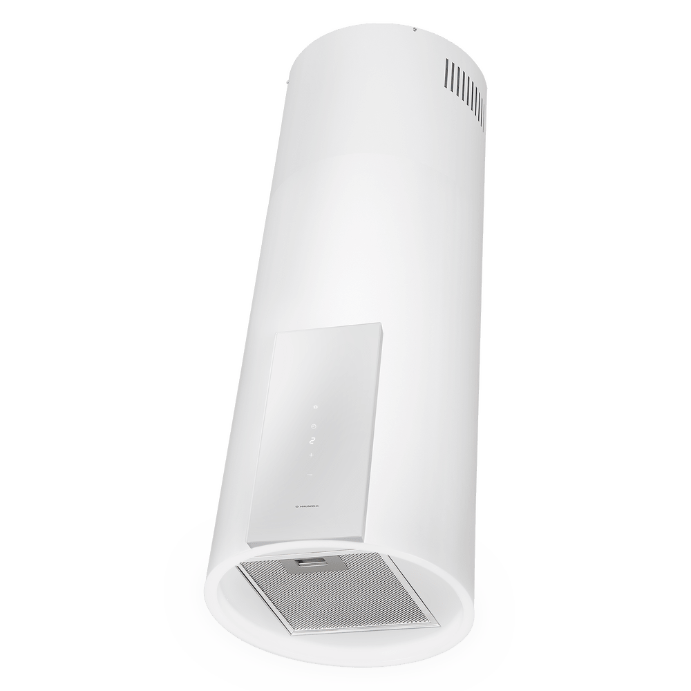 Кухонная вытяжка MAUNFELD ALBA 39 Isla белый — стильное решение для островной планировки и просторных кухонь. Цилиндрический корпус аккуратно крепится к потолку над варочной поверхностью и органично дополняет современный интерьер.