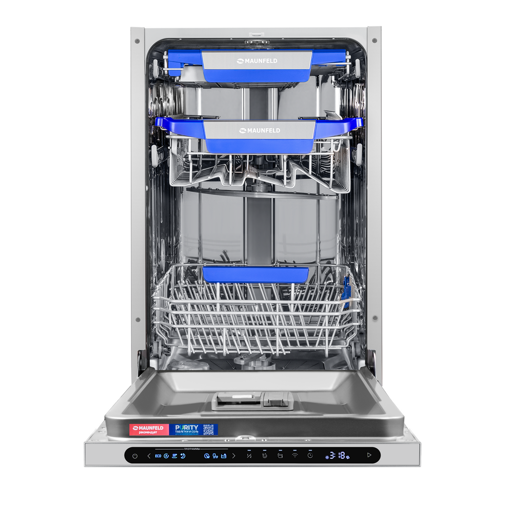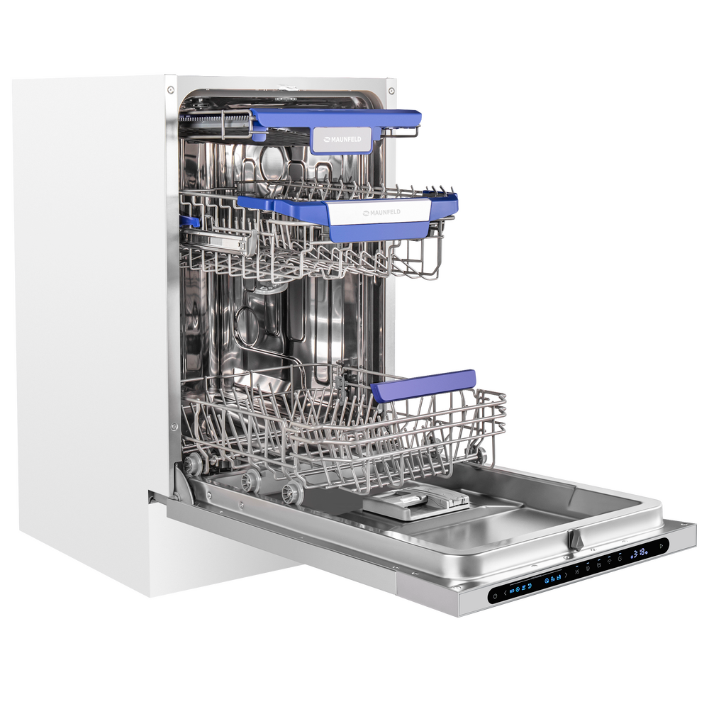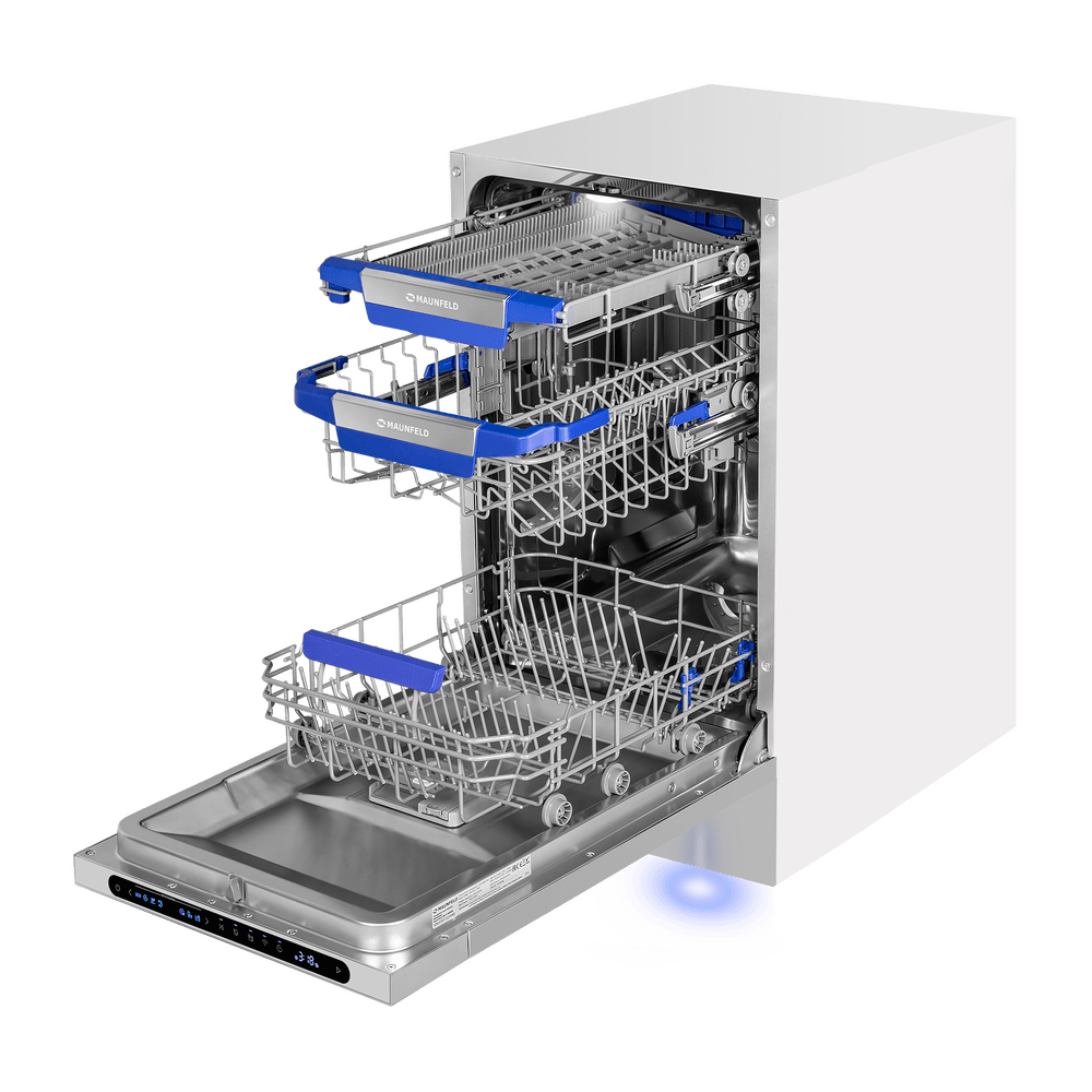 Посудомоечная машина MAUNFELD MLP45331T Light Beam Wi-Fi — удачное решение для кухни, где важно сохранить пространство: узкий формат с ширина 45 см позволяет встроить технику даже в компактный гарнитур без компромиссов по возможностям. При этом модель остаётся по-семейному практичной: вмещает до 10 комплектов посуды — удобно как для ежедневного цикла, так и после приёма гостей.