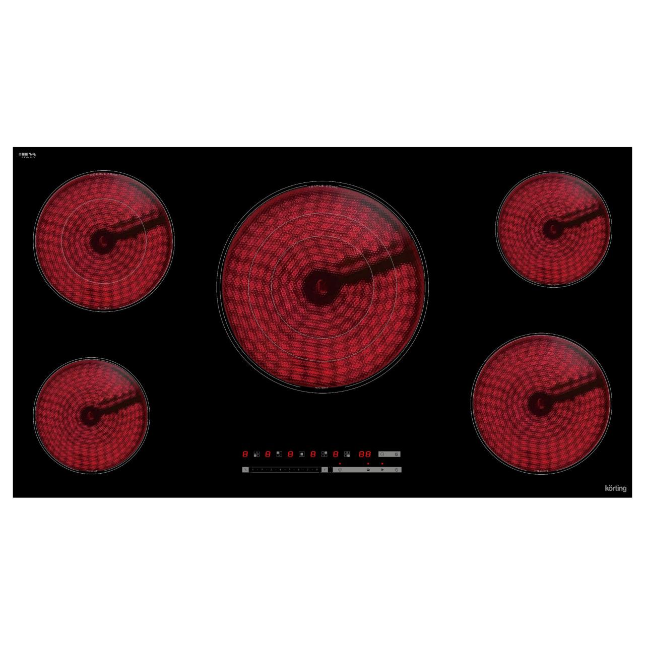 Предусмотрены две зоны расширения – тройная и двойная круглая конфорки, а также функция поддержания тепла для удобства в процессе готовки. Функция “Stop&Go” временно приостанавливает процесс, сохраняя все настройки и переводя их в режим поддержания тепла. Для возвращения к приготовлению необходимо повторно нажать на кнопку, и панель вернет все выставленные до паузы режимы. Электронный таймер автоматически отключает нагрев и уведомляет о завершении времени приготовления. Панель также включает блокировку управления для повышения безопасности.